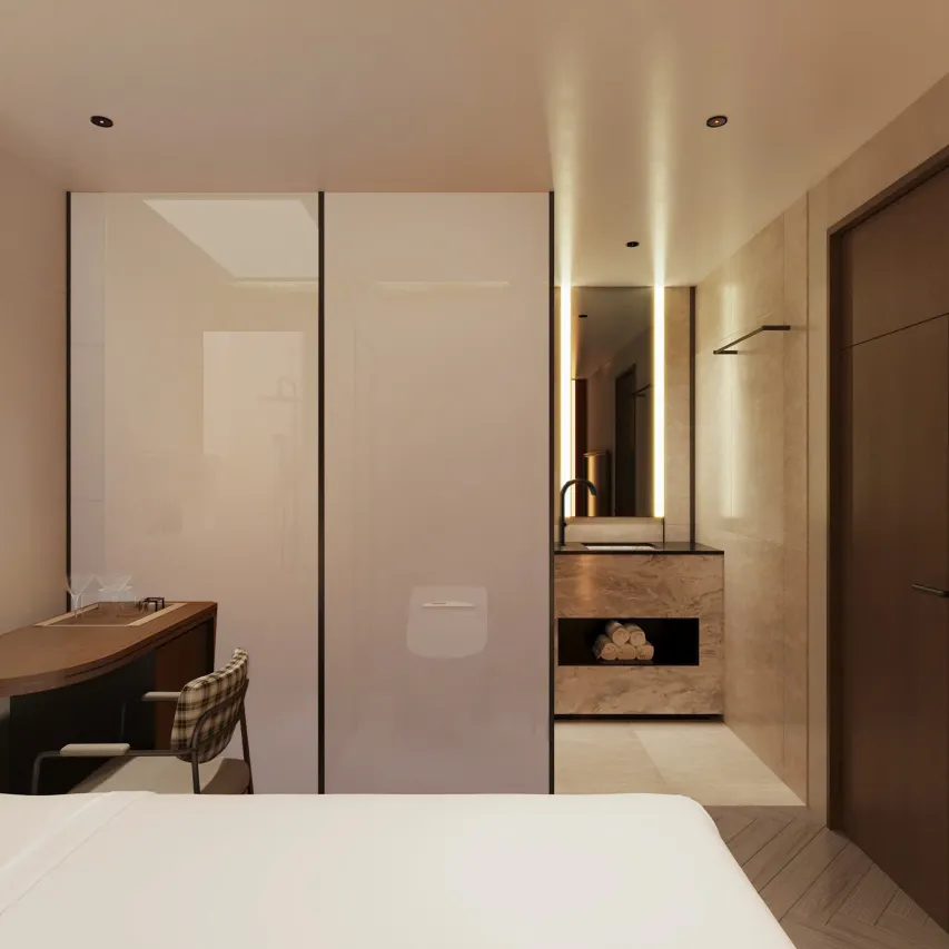 - Furniture:Â Wardrobe, dedicated work desk, and clothes hangers